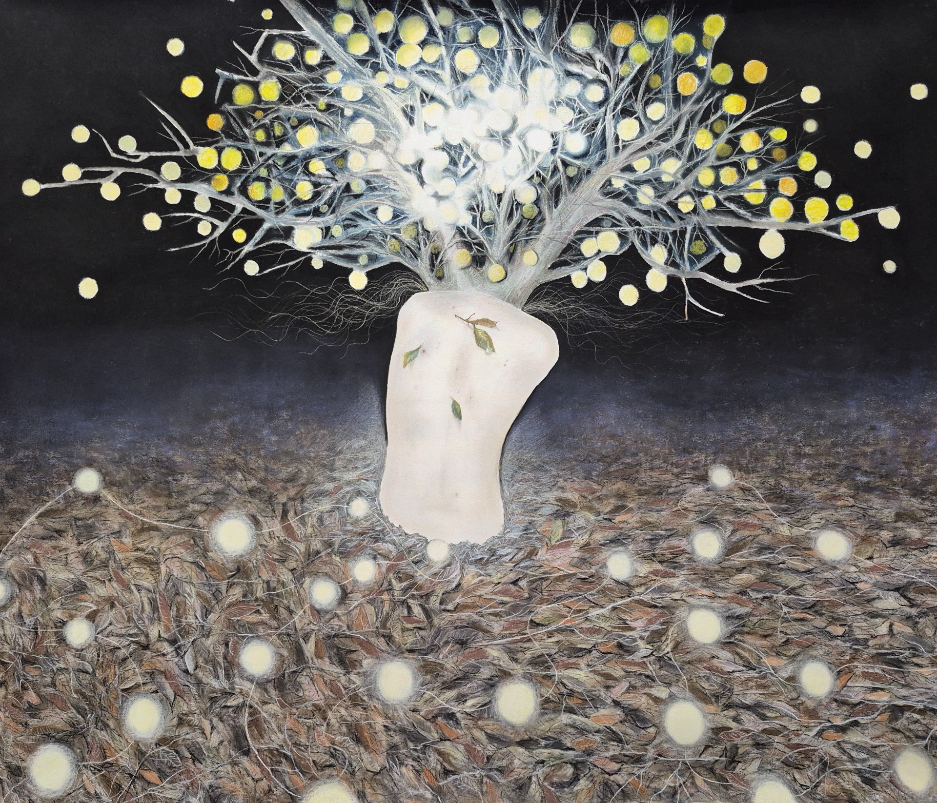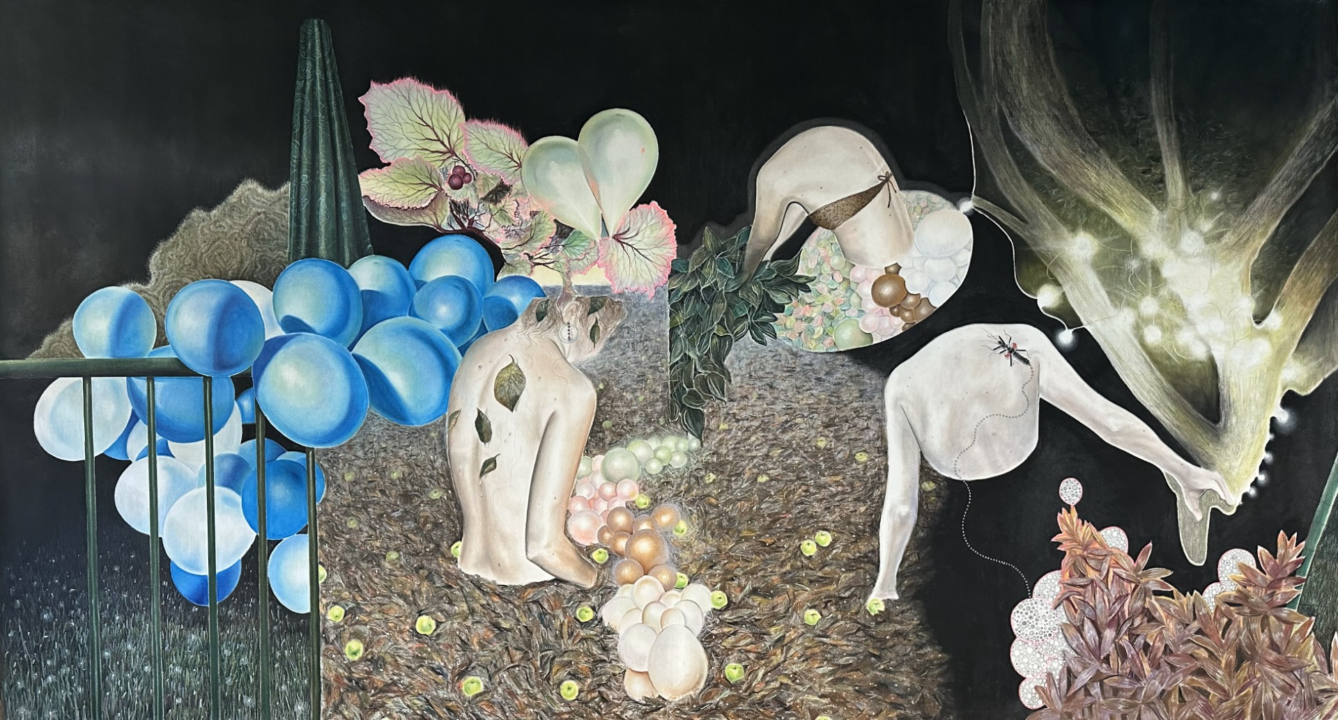 Čtvero ročních období, 2025, 72x115 cm, suchý pastel, tuš, mikrotužka na plátně