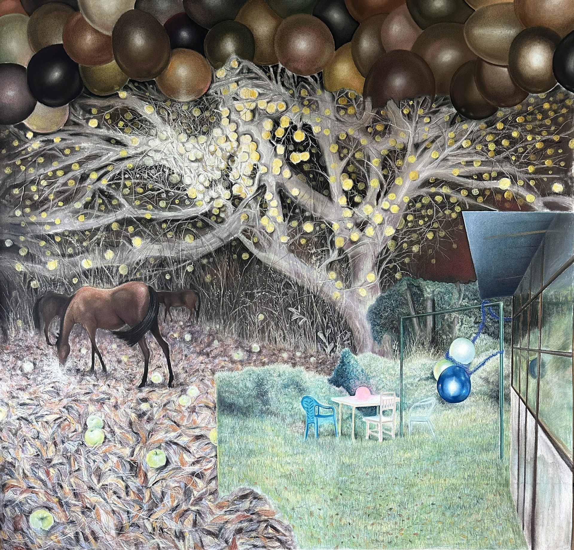 Planá jablka, 2025, 135x165 cm, suchý pastel na plátně