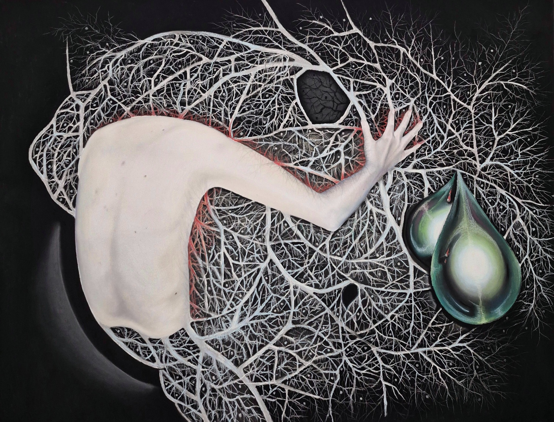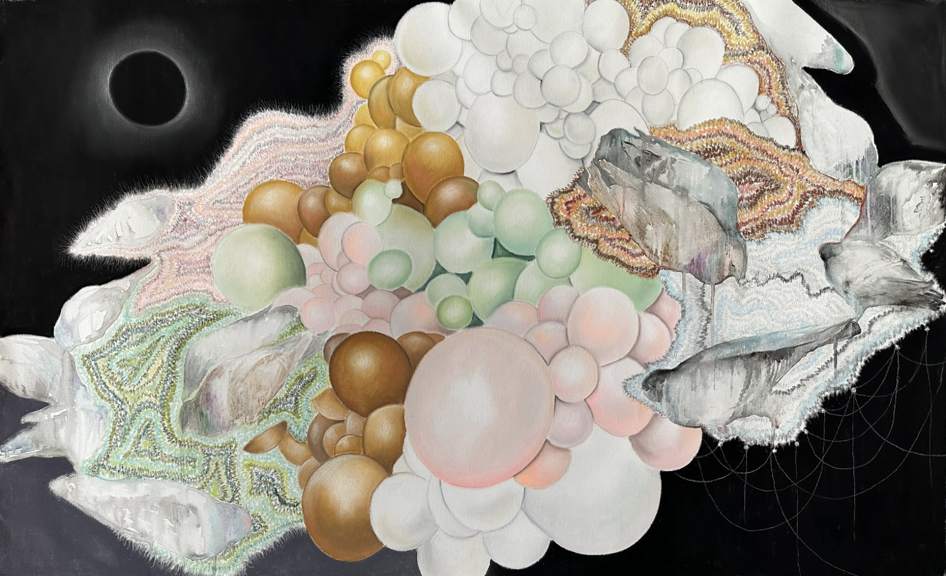 Polibek, 2025, 105x135 cm, suchý pastel, tuš, mikrotužka na plátně