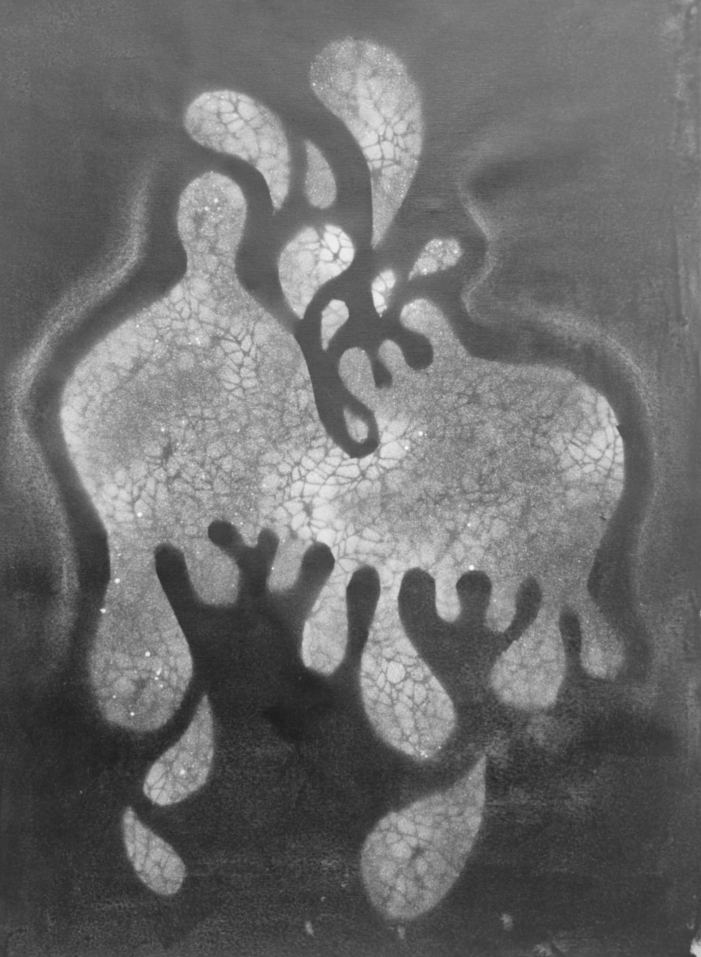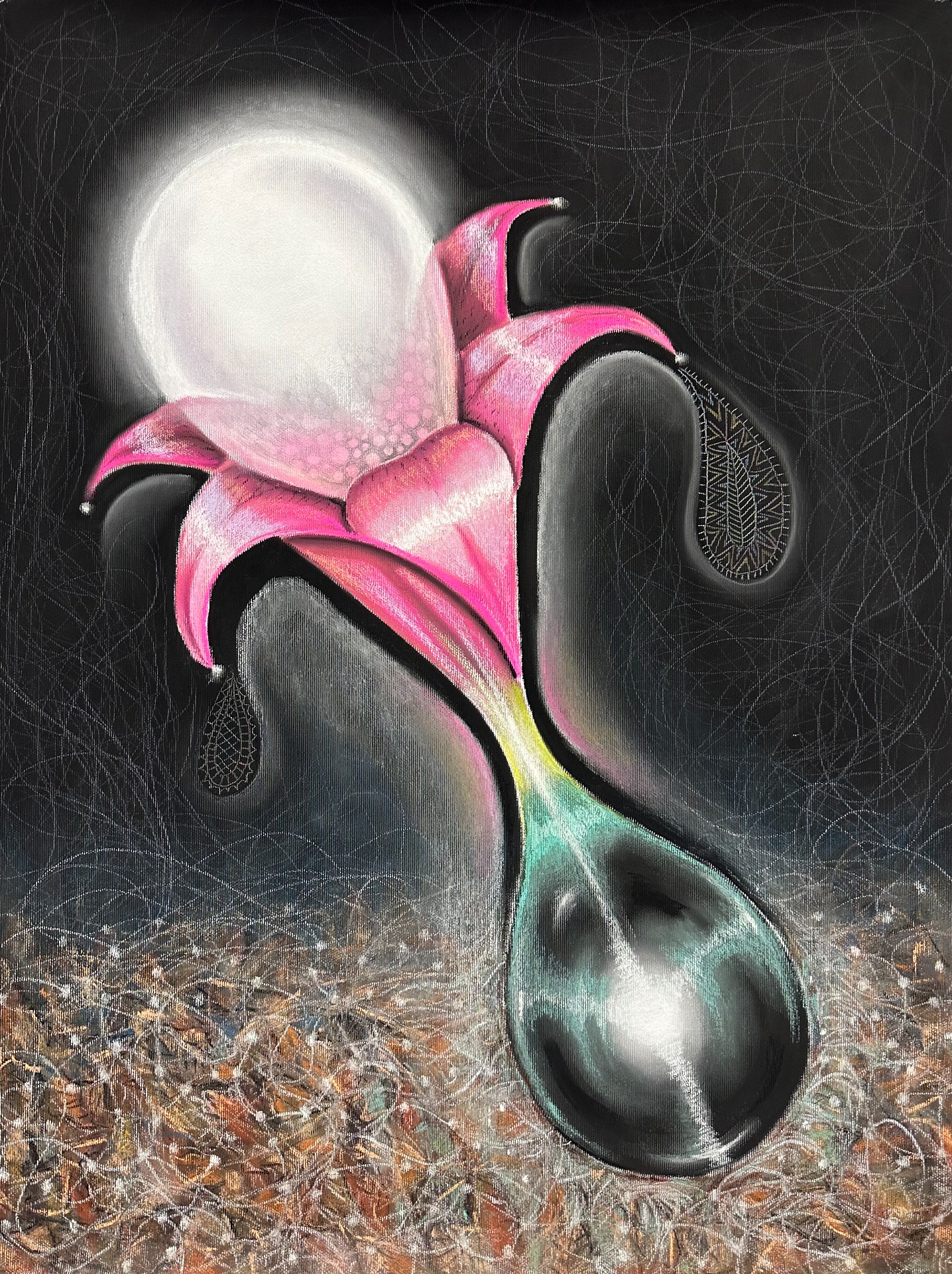 Zakořeněná, 2025, 80x72 cm, akryl, sprej, pastel na plátně,
