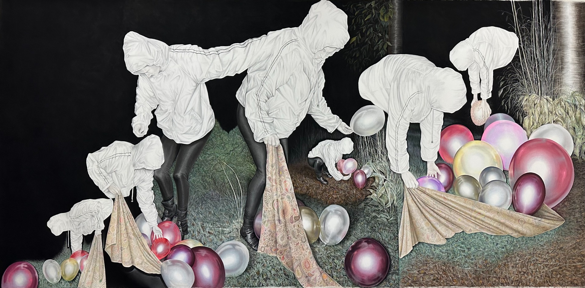 Collectors, 2023–24, 430 x 215 cm, soft pastel and micro pencil on canvas