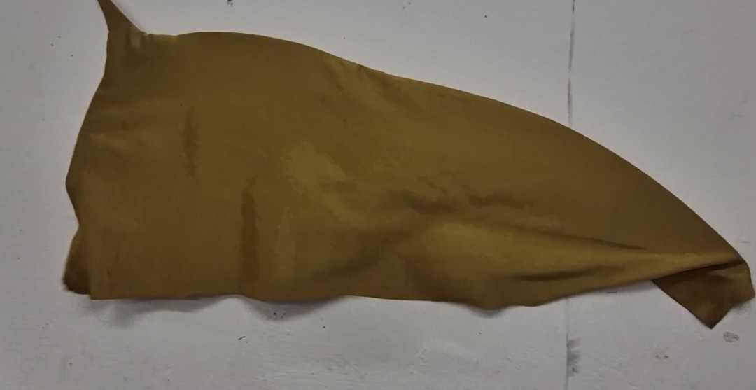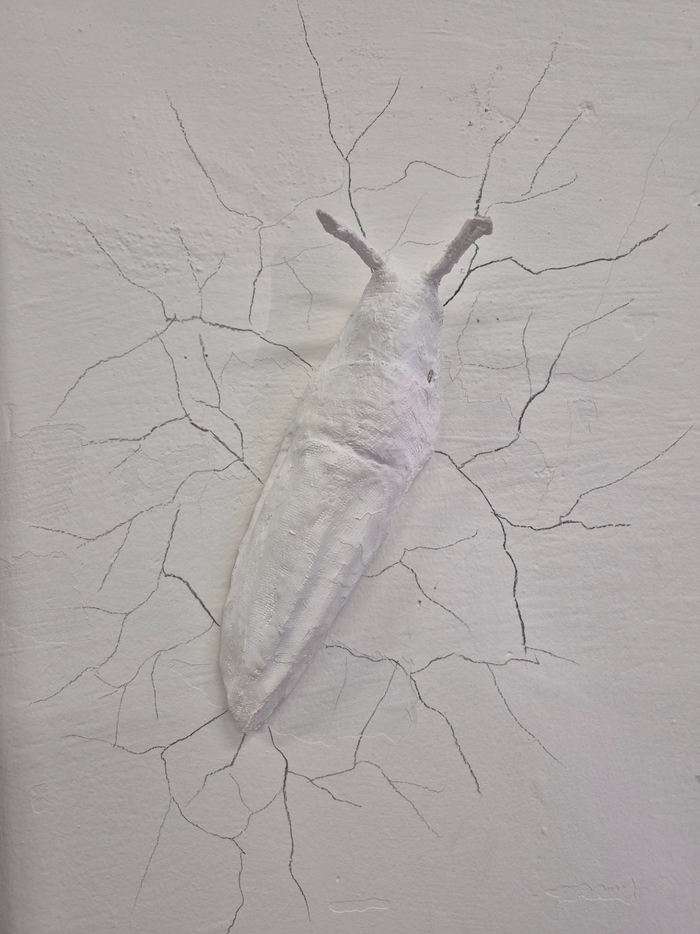 Pohyblivý objekt slimáka, 2025, 115x55 cm, textil na kartonu - S použitím foukacího přístroje se textil slimáka začne vlnit